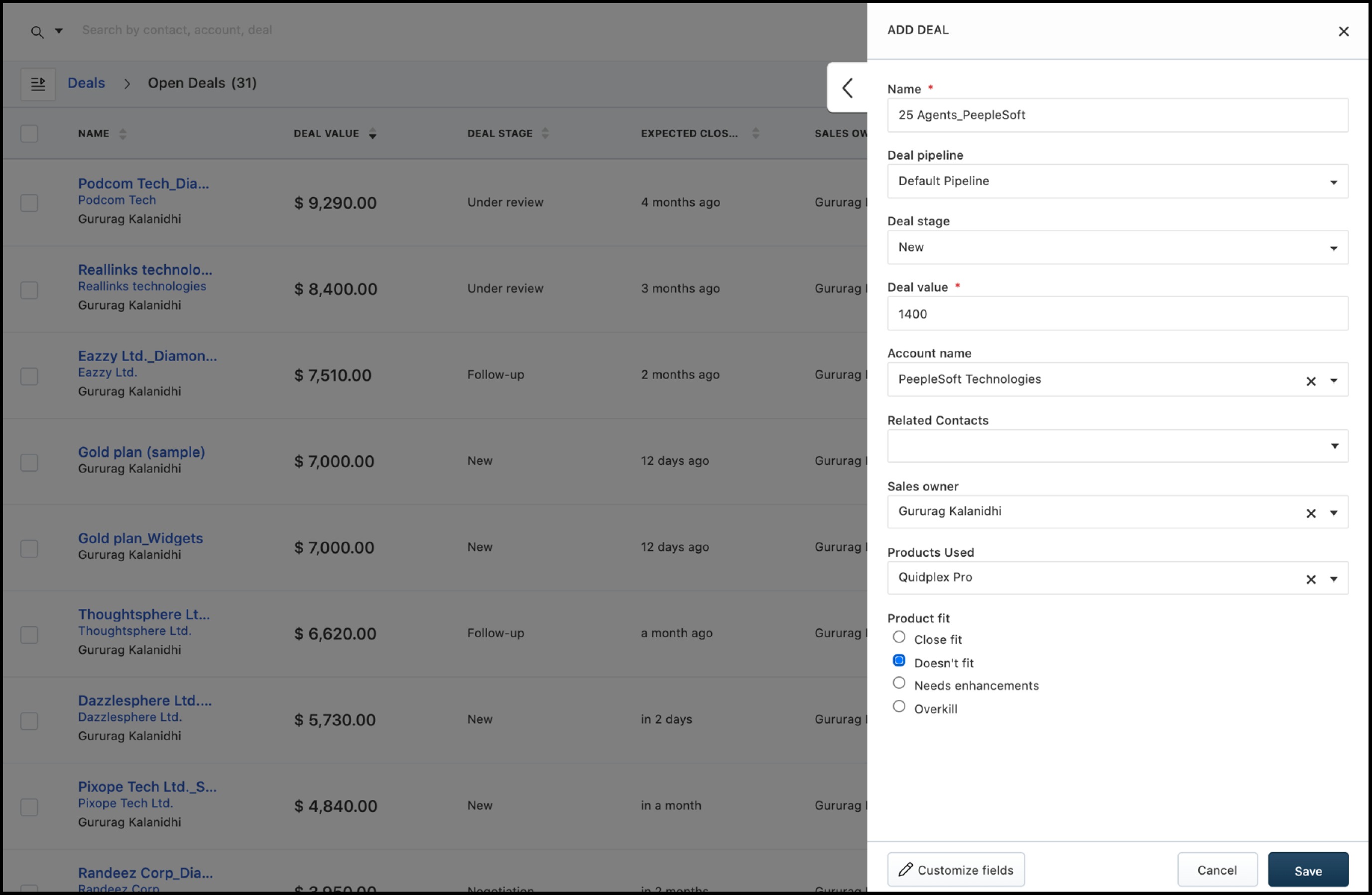 Kullanılan Ürünler, Ürün uygunluğu, Kurumsal Gereksinim vb. gibi anlaşma hakkında ek bilgileri yakalayan özel alanları içerir. Özel alanlar, anlaşma formları aracılığıyla manuel olarak veya içe aktarma sırasında ve CRM Kod Kitaplığı kullanılarak otomatik olarak doldurulabilir.